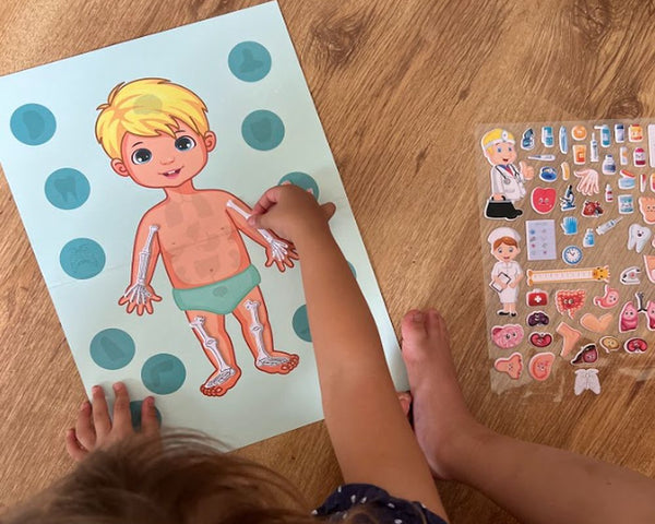 Az aranyos matricás szett kétoldalas hátteret, egyik oldalon orvosi rendelőt, a másikon és az emberi test különböző részeit ábrázolja.