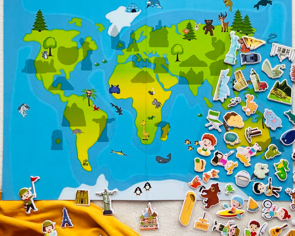 A matricás szett kétoldalas hátteret tartalmaz, egyik oldalon világtérképpel, a másikon egy hegyi turistaházzal.