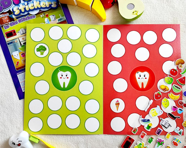 Az aranyos matricás szett kétoldalas hátteret, egyik oldalon konyhát, a másik oldalon egészséges/fájós fogakat ábrázol.