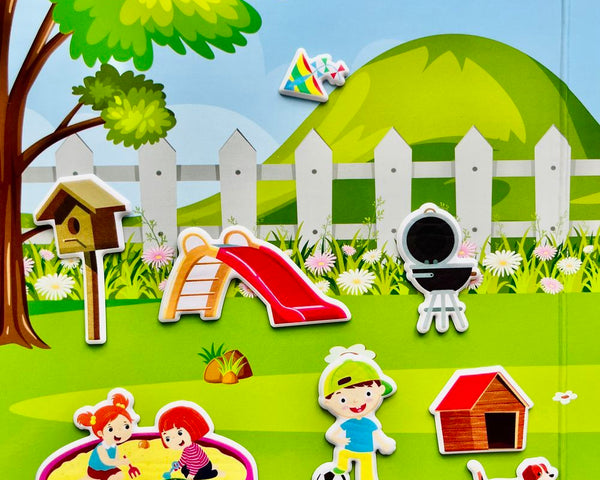 Az aranyos matricás szett kétoldalas hátteret, egyik oldalon szobákat, a másik oldalon a ház körüli udvart ábrázolja.