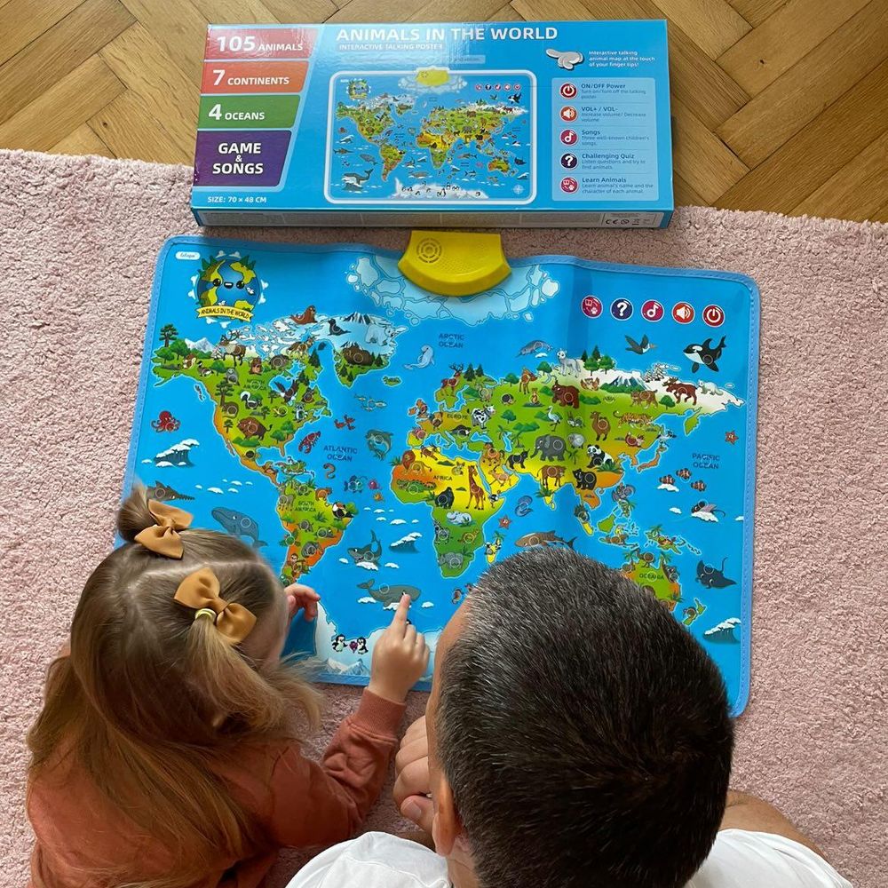 Ismerd meg a világ állatait ezzel a70×48 cm méretű, 105 állatot ábrázolótérkép - interaktív poszter segítségével! A világtérképen földrészek és óceánok alapján elosztva mutatjuk be az adott kontinensen elő állatokat.