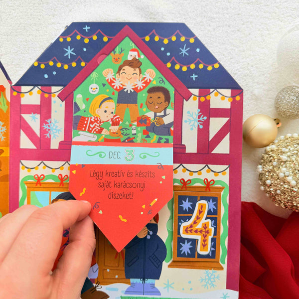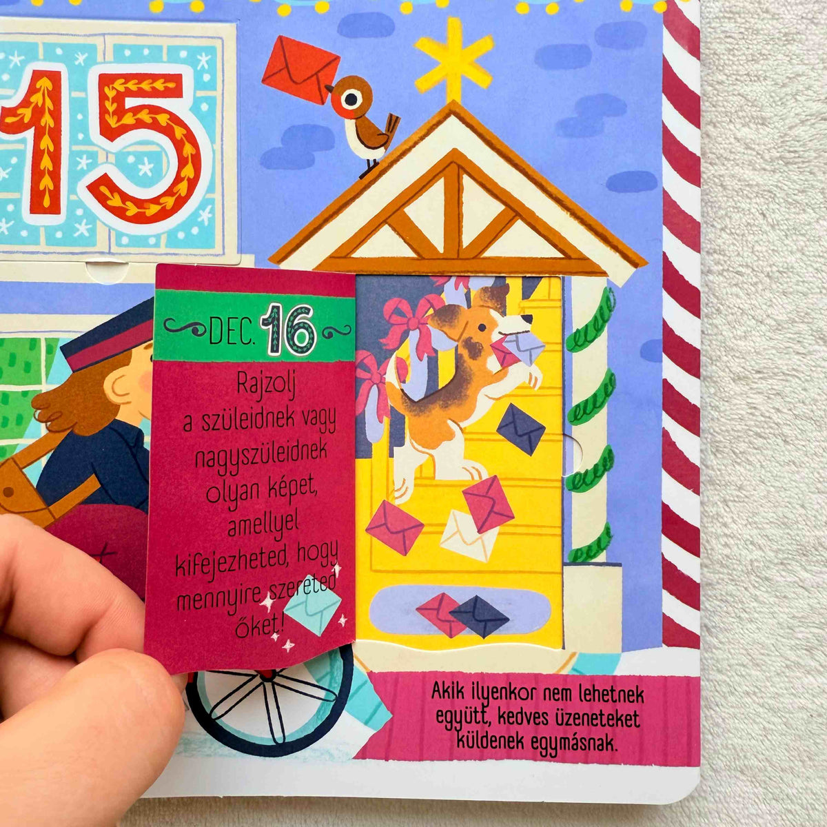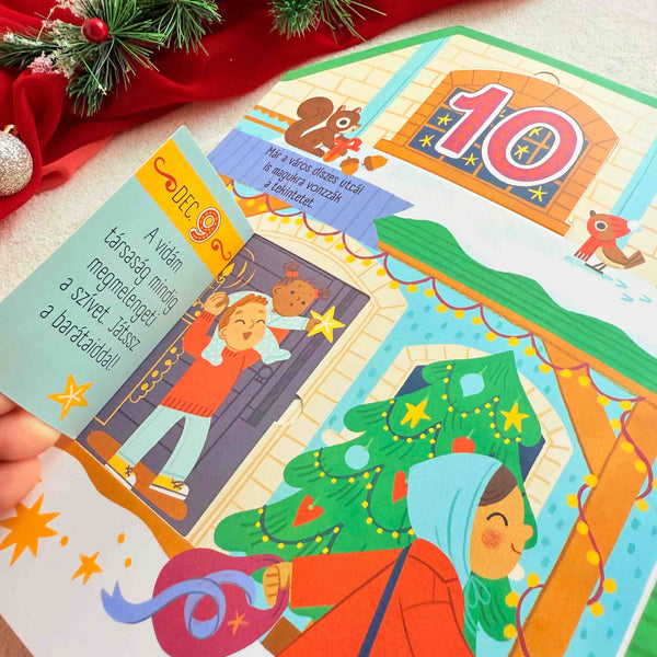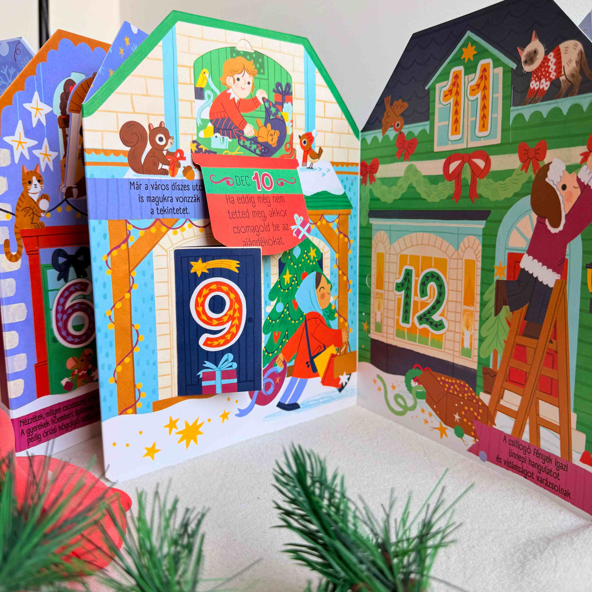 A történet játékos formában emlékezteti a gyerekeket arra, hogy a karácsony nem csak az ajándékokról szól, hanem a kölcsönös segítségről, a tiszteletről, az odafigyelésről és természetesen az örömteli, közös pillanatokról is. Egy apró, havas faluban játszódik, ahol minden decemberi nap történik valami. A könyvnek leporelló kialalkítása van.