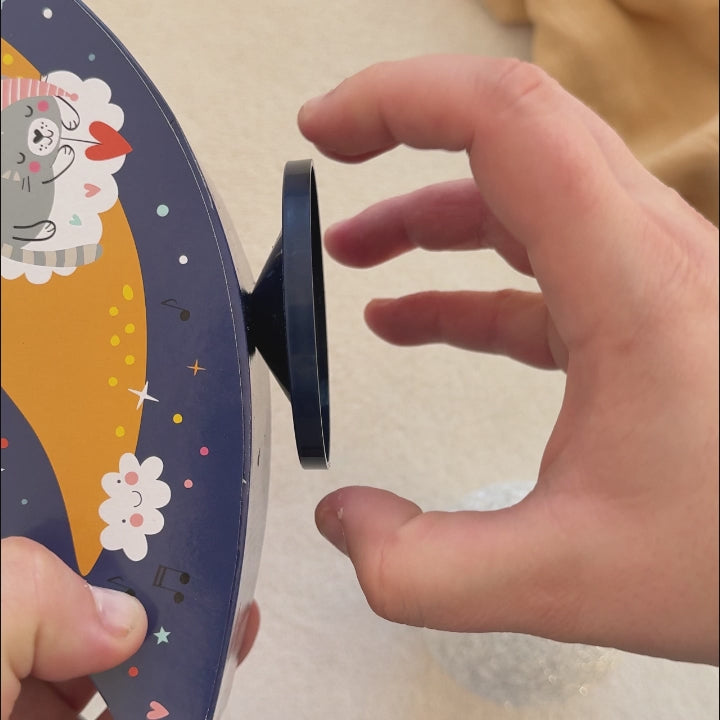 - A dallam elindításához forgassa többször a kereket, majd helyezze egyenes felületre (például éjjeliszekrényre), hogy a holdacska szabadon forogni tudjon.